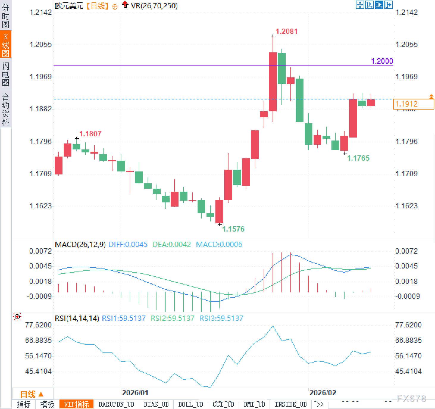 汇通财经APP讯――2月11日周三,欧元兑美元欧洲时段交投于1.1910附近,正处于过去几天形成的震荡区间内。虽然尚未突破上方关键阻力,但相较上周低点已累计上涨超过1%,显示出一定韧性。此前汇价一度冲高至1.2081后回落,随后进入整理阶段,短线多空双方围绕1.19展开激烈争夺。技术图形显示,日线级别MACD指标中DIFF为0.0045,DEA为0.0042,柱状图数值仅为0.0006,表明当前趋势虽偏多,但上涨动能并不强劲,更多体现为高位盘整而非单边行情。RSI指标读数约为59.5137,处于偏强但未过热的区域,与价格横盘状态基本吻合。