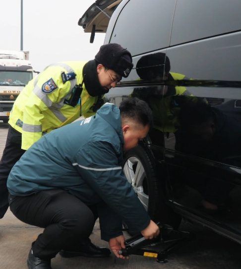 这些驿站不仅是简单的休息点,更是功能齐全的“暖心港湾”。各站点统一配备热水、姜茶、方便面、面包等基础补给品,以及急救药箱、暖宝宝、口罩等应急物资,及时为旅途劳顿的司乘人员补充能量、驱散寒意。在河南郑州,阳光志愿者在爱心服务站为往来群众送上春节慰问物品,传递阳光关怀;在沈阳王家沟高速口,志愿者在零下二十度的严寒中为过往车辆送上春联、台历,让年味与祝福随行;在山东烟台、吉林高速服务区,阳光财险联合交警设立的服务站点特别提供免费胎压检测、刹车安全检查等服务,从源头守护行车安全;在江苏徐州连霍高速出口,服务团队高效处理旅途中的保险咨询与突发问题,一位因车胎漏气获得及时换胎援助的车主由衷点赞:“太感谢了,服务又专业又暖心!”这些专业、高效的守护,让团圆之路更加顺畅安心。
