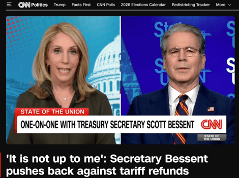 还有一个更现实的“回避点”:贝森特在镜头前把退款说成“不是关键问题”,这其实是在把政治风险与财政风险同时后推。因为一旦承认“应该退”,接下来就会面临三个更尖锐的问题:退给谁?退多少(含不含利息)?退款的钱从哪里出?这些都不是一句“等法院”就可以遮过去的。当天,多家媒体引述贝森特接受采访时的表述,称“退款由下级法院处理”,这与其说是法律判断,不如说是政治姿态,即在不承诺的前提下,把主动权留给时间。