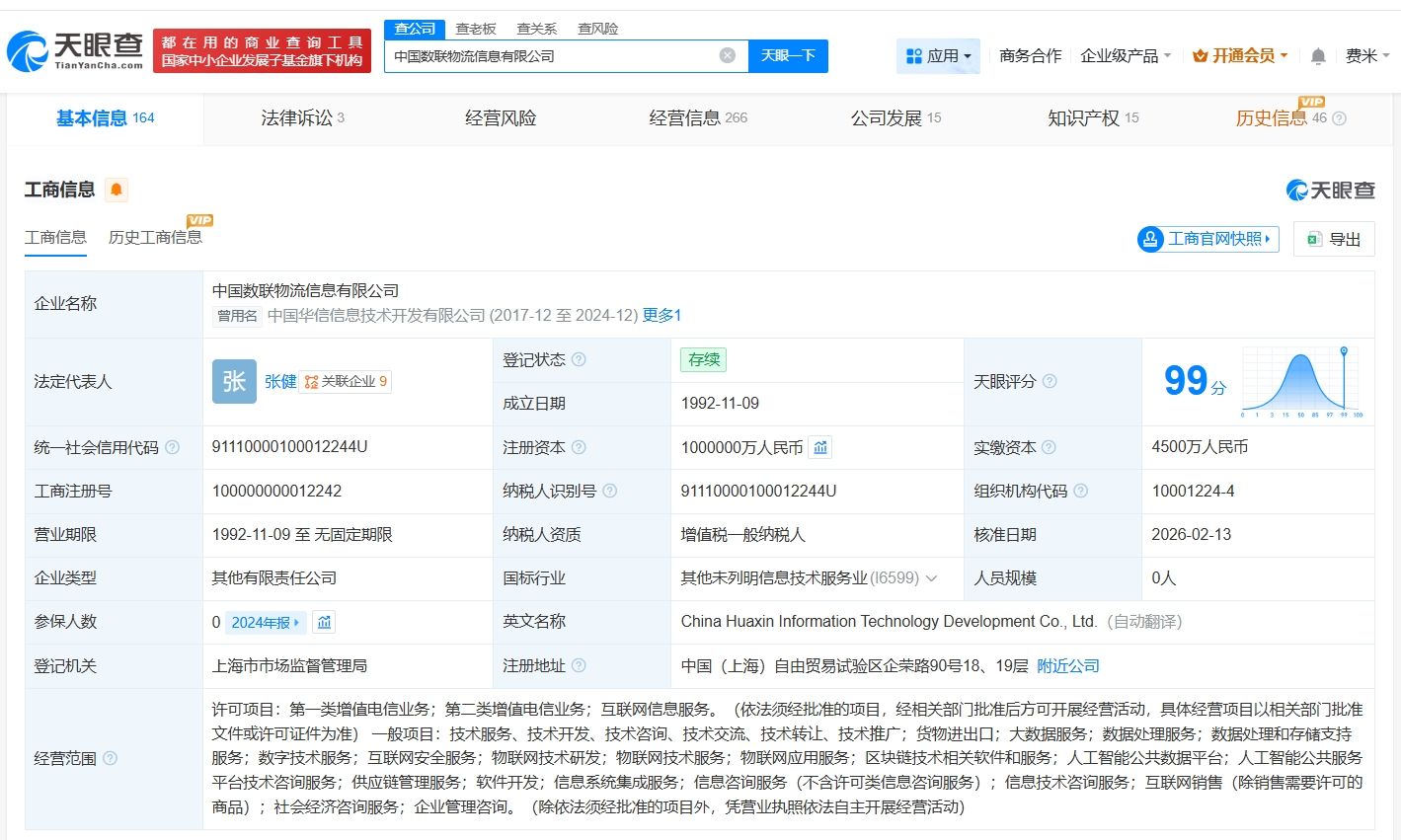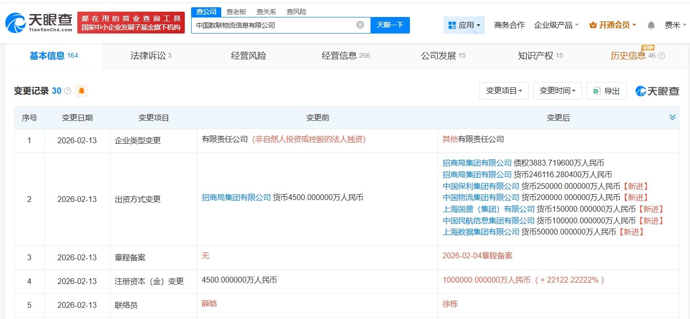 天眼查App显示,近日,中国数联物流信息有限公司发生工商变更,新增中国保利集团有限公司、中国物流集团有限公司等为股东,同时注册资本由4500万人民币增至100亿人民币,增幅约22122%。