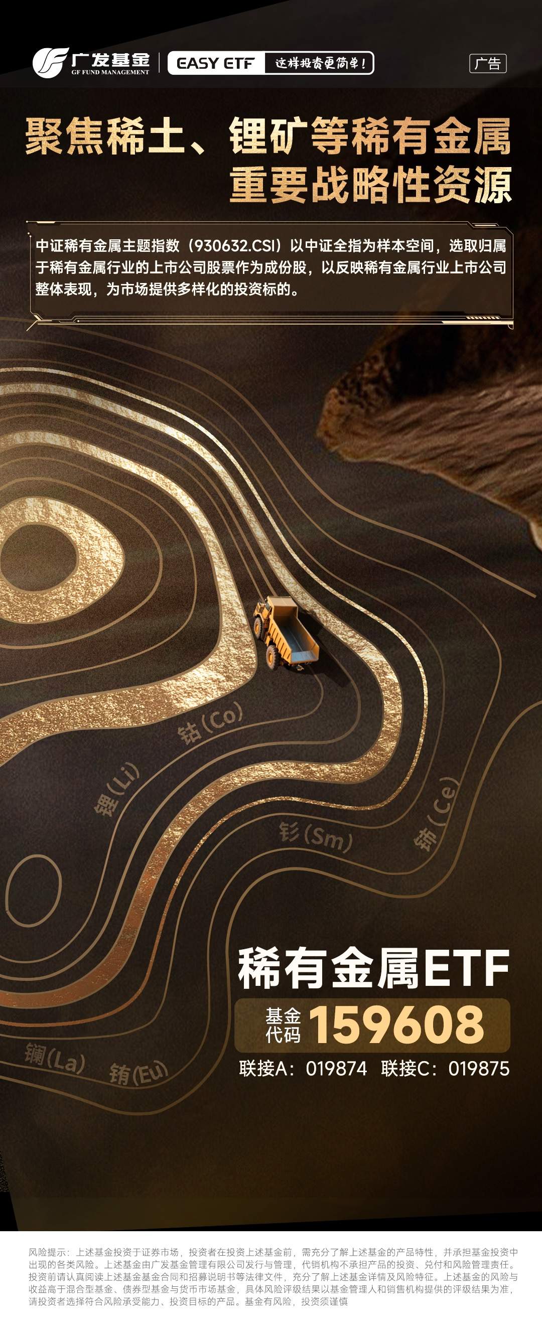 一键布局稀土+有色,稀有金属ETF(159608,联接A/C类019874/019875)跟踪中证稀有金属主题指数,指数样本聚焦不超过50家业务涉及稀有金属采矿、冶炼和加工的上市公司证券。截至2月24日,该指数申万三级前10大行业(及权重)分别为稀土(15.1%)、铜(14.1%)、锂(13.4%)、其他小金属(11.5%)、钨(8.0%)、钴(7.3%)等;前十大权重股覆盖洛阳钼业、北方稀土、华友钴业、盐湖股份、赣锋锂业、厦门钨业等资源龙头,前十大权重股合计占比近60%。