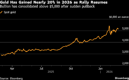 黄金价格逼近每盎司5,200美元,在过去六个交易日中累计上涨近6%。美国在中东增兵令全球市场保持警惕。华盛顿对30多家支持伊朗石油和武器销售的实体实施制裁,在周四于日内瓦举行的最新一轮核谈判前加大了对德黑兰的施压力度。