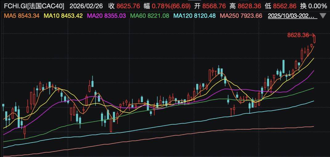 再来看看法国市场,截至2月26日发稿,法国CAC40指数已经上涨至约8640点,创下历史新高。2025年全年,法国CAC40指数上涨了10.42%,今年则继续上涨接近6%。并且由于新一轮企业财报的发布,市场情绪依然乐观。