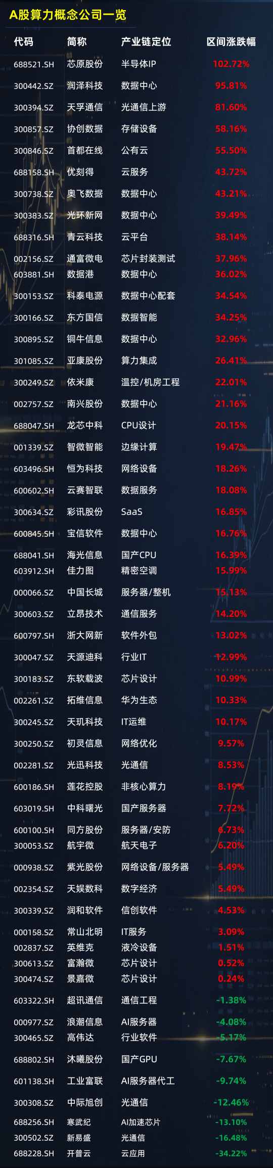 注:以上A股算力概念股划分参考万得AI算力概念指数(8841678.WI )最新成分股,包含服务器、芯片、IDC等算力相关的代表性公司。区间涨跌幅指2026年1月1日至2月27日。