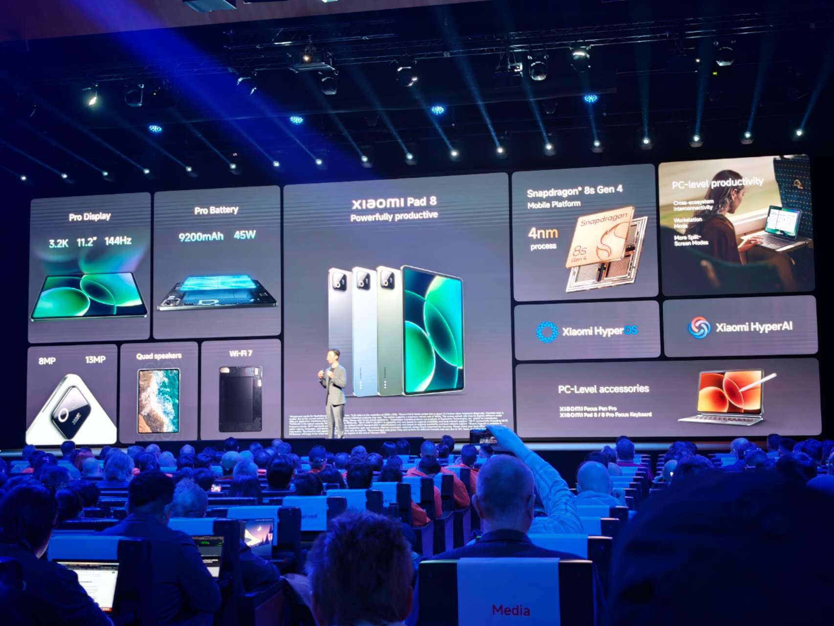 发布会还带来了11.2英寸屏幕的小米平板Pad 8 Pro,配备骁龙8S Gen4处理器,9200毫安时电池,支持67瓦快充,售价599欧元,折合人民币约4855元。小米Watch 5、小米电动滑板车6 Ultra、红米Buds8 Pro、小米移动电源UltraThin等新品也在本次发布会上一并发布。