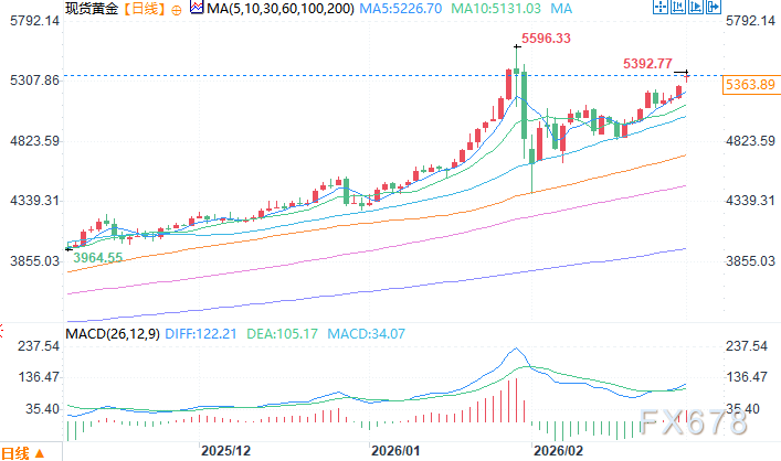 汇通财经APP讯――黄金从 5400 美元区域回落,该区域是自 1 月下旬以来的最高水平,周一的亚洲交易时段曾触及,不过它成功保持在 5300 美元的整数关口上方。目前黄金的交易价格高于 5300 美元的中位,交投于5350关口附近,当日上涨超过 1.0%。