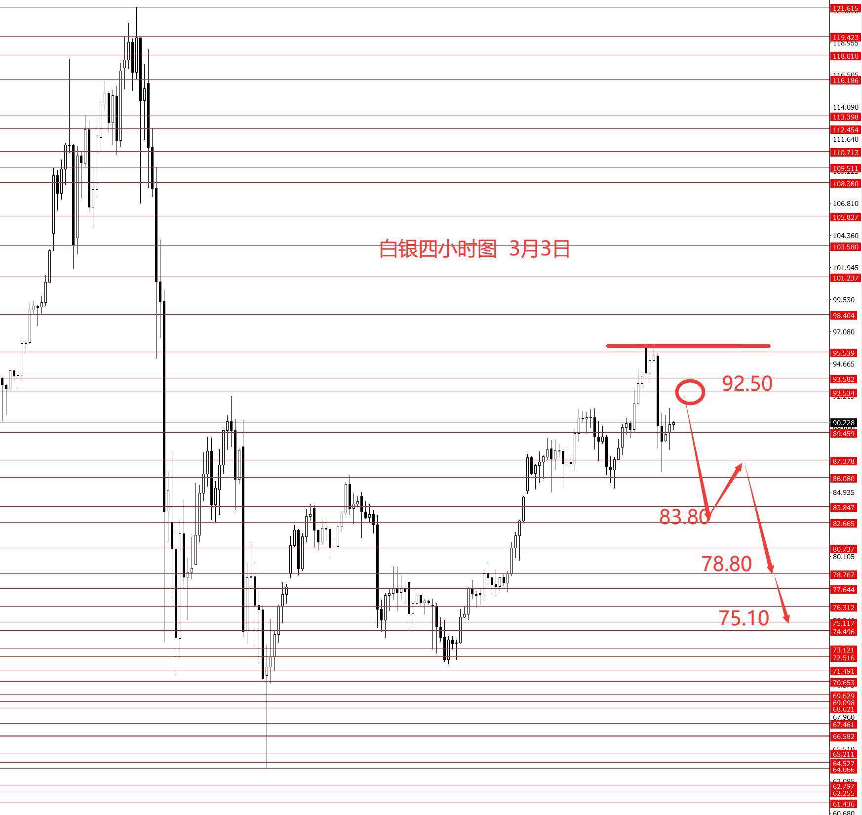 白银上周正如预期震荡上行,但黄金到达了5320,白银也只到达95.50区域。昨日同时承压回落,白银昨日收阴柱。从图形来看,白银小顶部出现,今日激进者可进场做空白银,操作建议:92.50-91.20区域做空,止损96.50,目标看向83.80和80.70和78.80,若力度较大再关注75.10区域。控制仓量,严格止损。