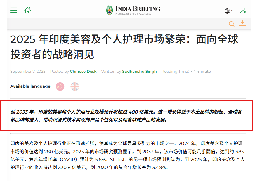 印度美容个护市场2024年规模预计已达280亿美元,并保持稳步增长,预计2033年市场规模将突破480亿美元。2025 年9月起,洗发水、牙膏等日常个护产品商品及服务税从18%大幅降至5%,直接刺激大众消费需求。中印消费者肤质相近,中国美容个护产品在配方、功效上具备天然适配性,同时高性价比、品类丰富的优势,契合印度消费升级的需求。