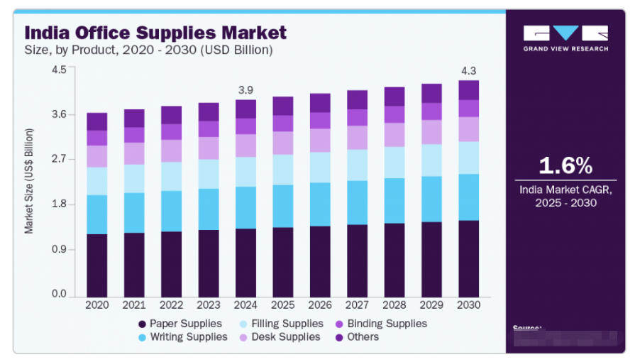 印度办公用品市场2024年规模达39.1亿美元,预计2025年至2030年复合年增长率为1.6%。IT与服务业扩张催生4000万白领阶层,对人体工学、设计感办公产品需求激增,“创业印度”计划孵化10万家初创公司,推动企业礼品与办公耗材采购量大幅增长。