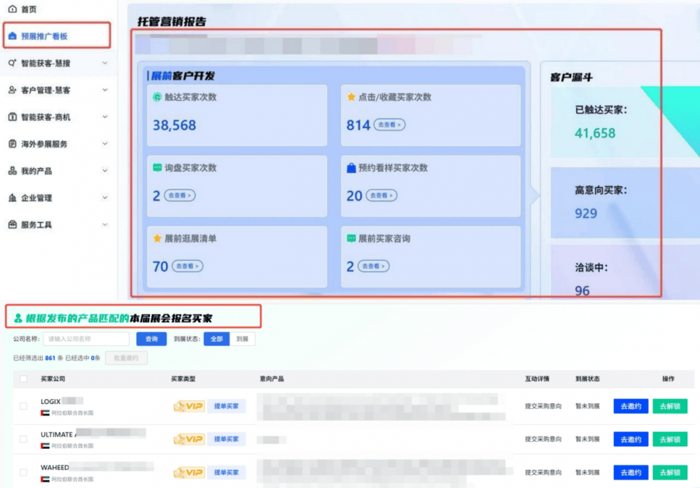 优先获得高价值推荐买家清单:根据产品标签,获得精准匹配的优质买家,可提前邀约、查看并锁定高意向商机。