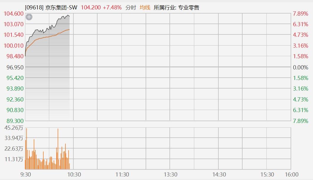 昨晚公布业绩的京东集团-SW(9618.HK)今早拉升,盘初一度涨近8%报104.6港元。