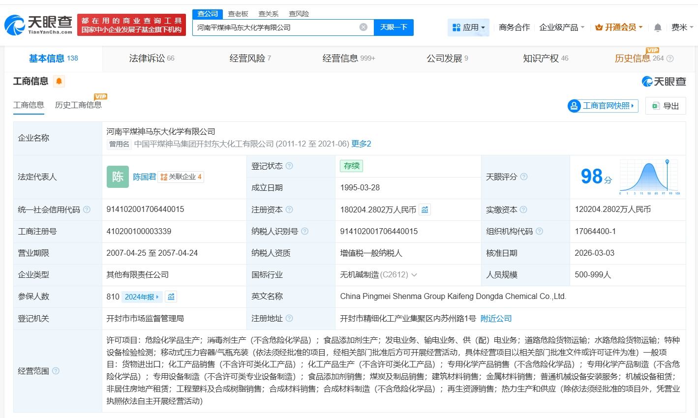 天眼查App显示,近日,河南平煤神马东大化学有限公司发生工商变更,付汉卿卸任法定代表人,由陈国君接任,同时注册资本由约12亿人民币增至约18亿人民币,增幅约50%。