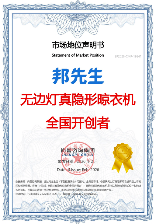 2月,邦先生正式被授予“无边灯真隐形晾衣机全国开创者”市场地位声明证书。这不仅是对邦先生技术创新的高度肯定,更标志着高端隐形晾晒赛道迎来了真正的行业定义者。