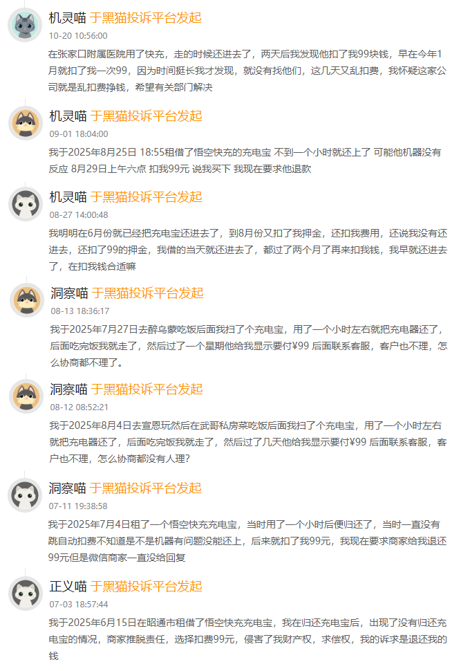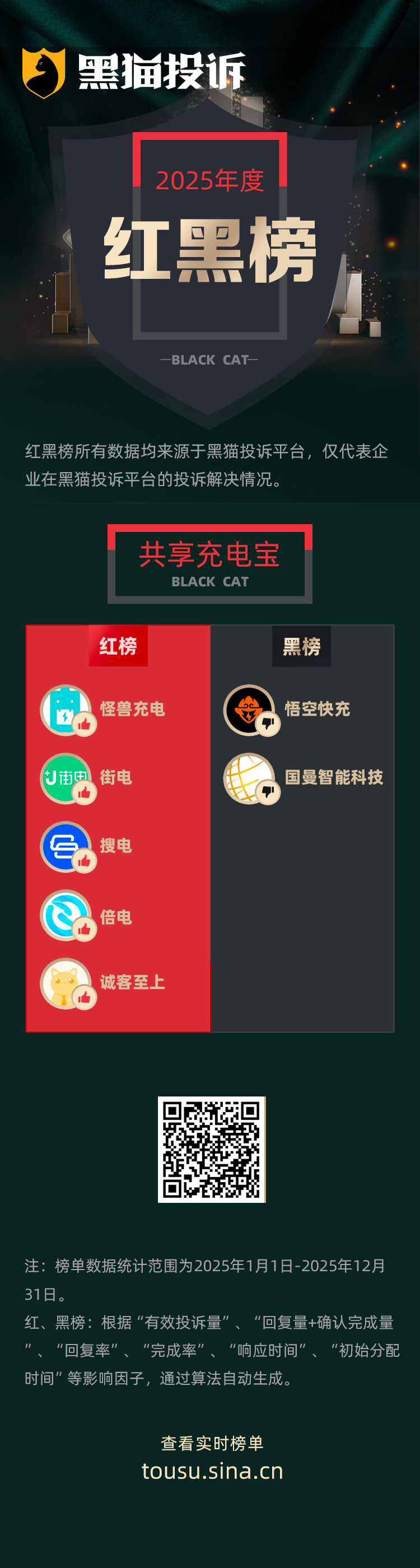 黑猫投诉发布2025年度共享充电宝领域红黑榜榜单:悟空快充共享充电宝归还后仍被扣99元