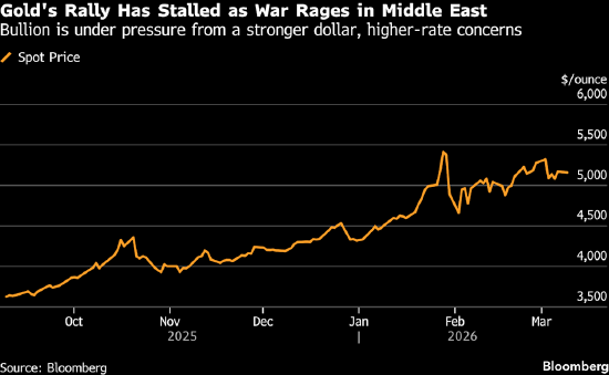 黄金一度暴跌3%,至每盎司约5015美元,为一个多月以来首次周线下跌,随后跌幅有所收窄。随着美国和以色列与伊朗的冲突未见缓和迹象,波斯湾地区主要油气生产国纷纷减产,美元兑所有主要货币走强,美元指数一度上涨0.7%。