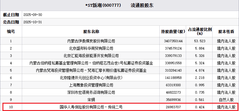 截至2025年9月30日,*ST新潮前十大流通股股东中,国华人寿保险股份有限公司-传统二号持有0.424%流通股,为第十大流通股股东。