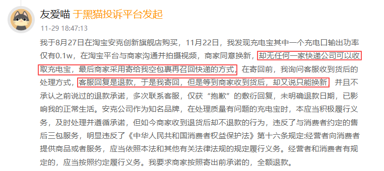 黑猫建议:安克产品投诉集中在质量稳定性与售后执行力两大短板。建议消费者优先选择官方自营渠道购买,收货时录制开箱视频,使用中定期测试充电效率。若遇纠纷,固定证据后第一时间通过黑猫投诉发起维权,避免与商家长期扯皮。对于需召回的批次,严格按官方流程操作并保留每一步凭证,防止商家事后刁难。
