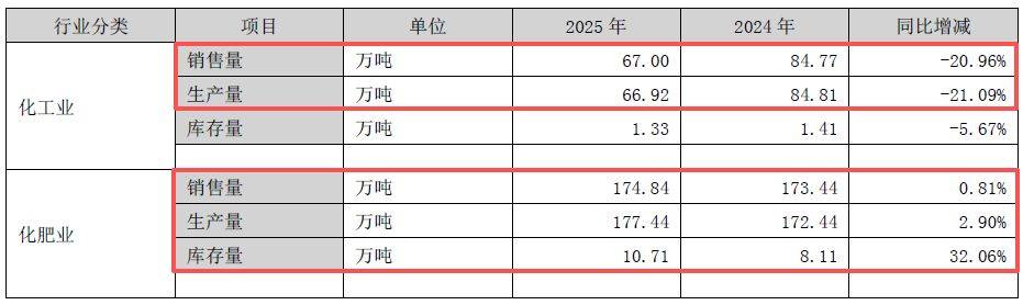 在主营业务明细中,泸天化化工业销售量同比下跌20.96%,生产量下滑21.09%。更值得警惕的是,尽管化肥销量微增0.81%,但化肥业的库存量达到10.71万吨,同比激增32.06%,反映出在需求端疲软的情况下,去库存压力高企。
