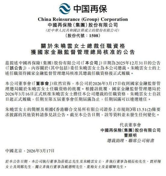 中国再保险首位女总裁就位,朱晓云任职资格获批