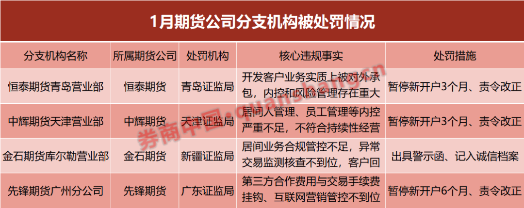 多家期货公司被监管“点名”,处罚直指居间业务、内部控制、互联网营销等核心违规领域,既有警示函、监管谈话等柔性约束,更有暂停新开户等实质性业务限制。