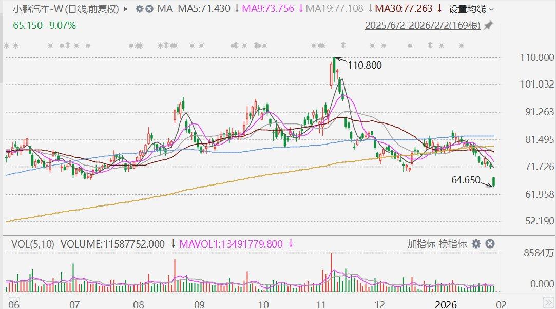 小鹏汽车-W(9868.HK)盘初大跌近10%,报64.65港元,股价创2025年4月以来新低。消息面上,小鹏汽车昨日公布,2026年1月共交付新车20011台,这一数据明显落后于蔚来和理想,同比下降34.07%。