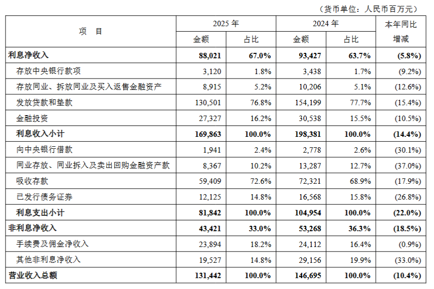 2025 年,集团实现利息净收入 880.21 亿元,同比下降 5.8%,主要受贷款利率下行和业务结构调整等因素影响,净息差 1.78%,同比 2024 年下降 9 个基点。