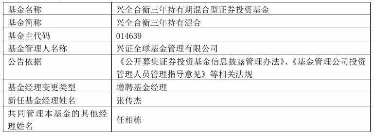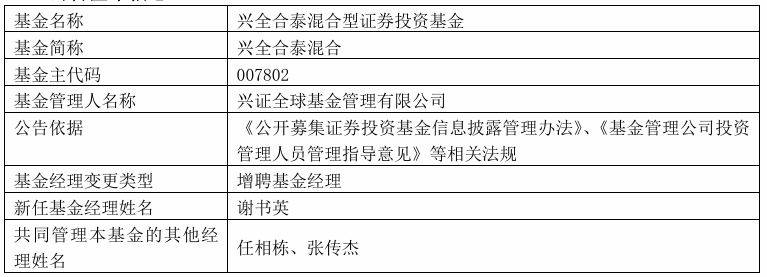 近日,兴证全球基金公告称,兴全合泰混合增聘谢书英为该基金的基金经理,与任相栋、张传杰共同管理。同时,兴全合衡三年持有混合增聘张传杰为基金经理,与任相栋共管。