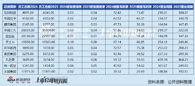 此外,东阿阿胶(184.07天)、太极集团(192.51天)营业周期在200天以内,属于行业运营效率中等偏上阵营,且东阿阿胶较2024年的218.0106天大幅缩短33.94天,成为运营效率提升最快的企业。