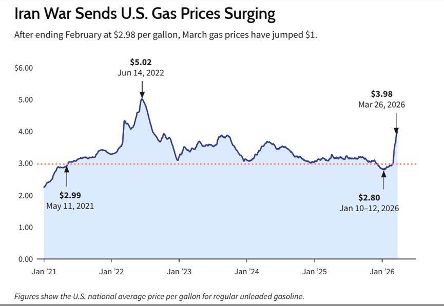 美国汽车协会3月26日最新数据显示,美国汽油均价单周涨幅达10美分,单月涨幅更是高达1美元,每加仑汽油价格从2月26日的2.98美元,短短一个月飙升至3.98美元。随着伊朗相关地缘冲突持续,国际原油价格居高不下,美国汽油均价恐将触及每加仑4美元,将是自2022年8月以来首次。随着春假季持续,汽油需求亦在攀升,这也是加油站油价上涨的另一因素。