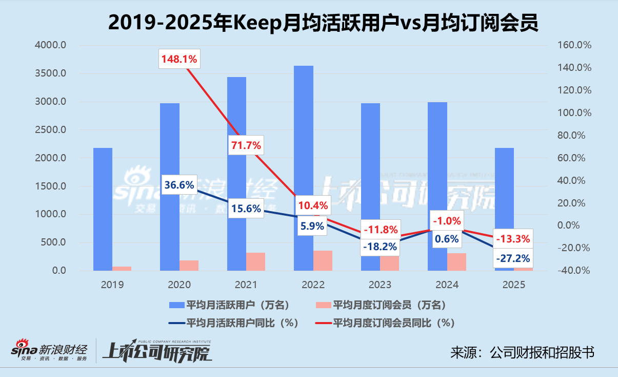 尽管财报努力维系着“岁月静好”的画面,Keep的用户数据还是释放出不容乐观的信号。报告期内,公司的平均月活跃用户共计2177.20万名,同比下降27.2%,约合814.9万名用户流失。与2022年巅峰时期相比,Keep的月活用户数量累计减少近1500万名,甚至比2019年还要少。