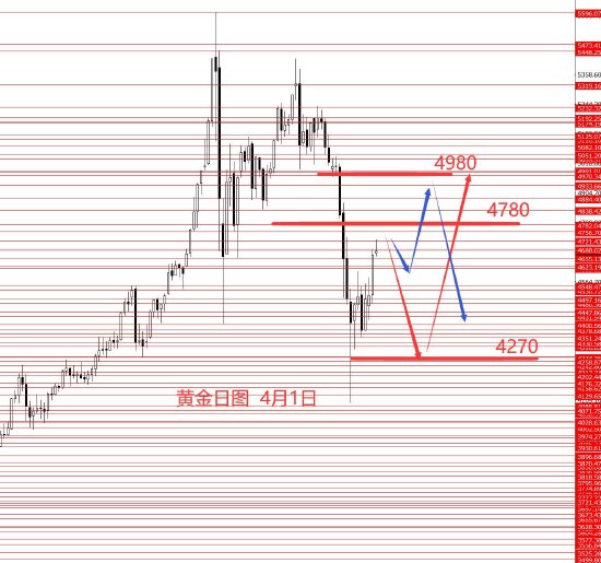 黄金三月也正如预期从5370跌至4780,最低4100附近,黄金中线波段思路正确。从图形来看,黄金四月区间震荡的概率相对较大些,区间先关注5000至4270,本月二次下探4270的概率相对较大些,只是不确定是先测试了5000再跌,还是连4780都上不去先下探4270再向上测试5000区域。今日没有具体操作建议,只有一个大概框架,重点关注周五非农数据,下周一行情明朗些会再更新文字稿件,大家敬请期待。