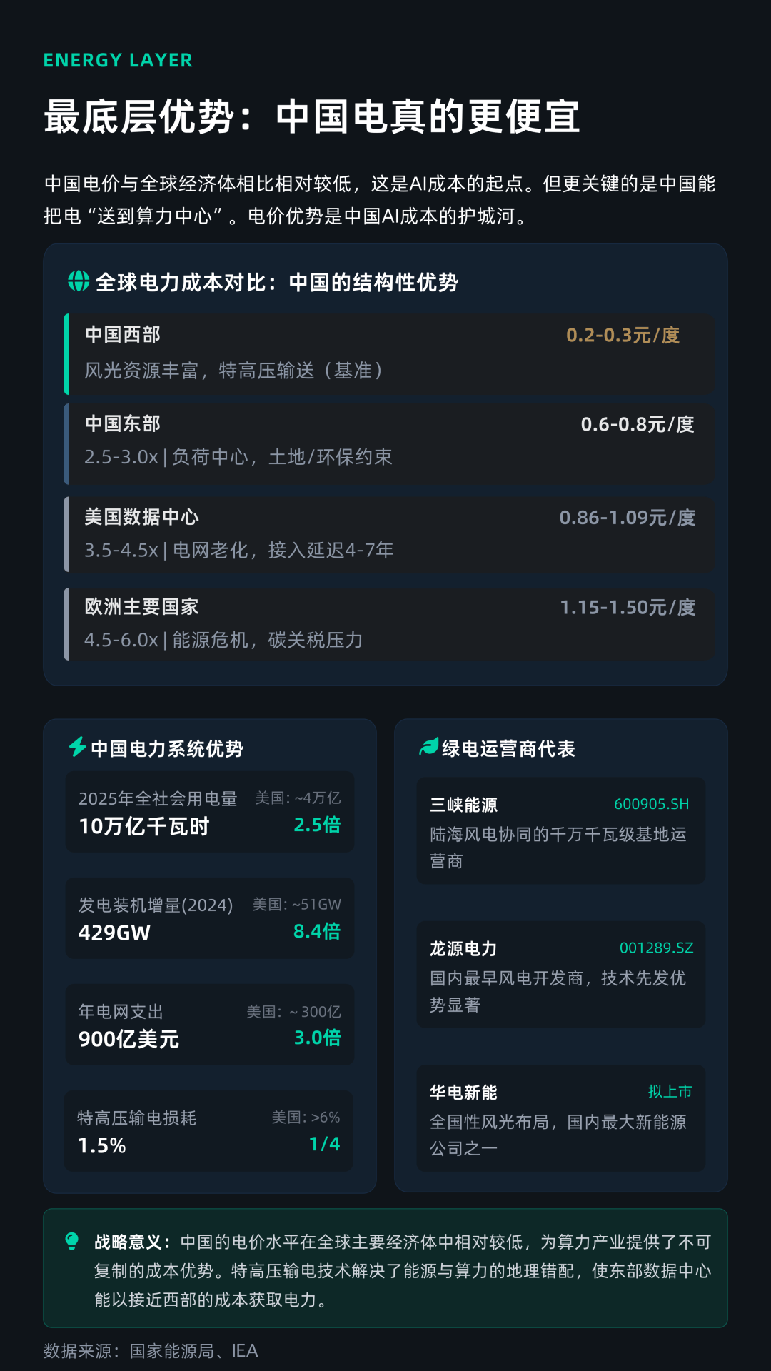 正是在这一完整链条协同下,Token的价值实现了约数十倍以上的放大:从0.2元/度电,到可售卖为美元计价的AI服务。这种系统性降本能力,并非单一要素驱动,而是中国“低电价+高能效算力+高效模型架构+应用爆发”的系统性竞争优势共同作用的结果,构成了中国在全球AI竞争中的核心护城河。
