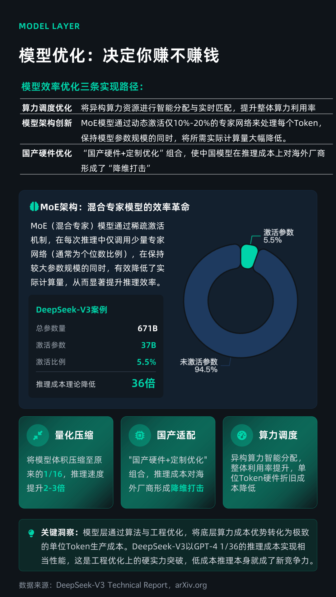 从产业链拆解来看,Token出海是一条典型的价值放大链条。最上游是能源层,中国西部绿电成本约为0.2-0.3元/度,仅为欧美的约1/5,构成全球竞争中低成本的“原材料”护城河;中游是算力层,通过数据中心(AIDC)将电力转化为计算能力,液冷等技术将PUE降至1.25以下,大幅提升能效;再往上是模型层,以DeepSeek为代表的混合专家(MoE)架构,仅激活约5%参数即可完成推理,理论上将成本降低至GPT-4的1/30以上;最终在应用层,AI Agent(智能体)的兴起,使Token需求呈指数级增长,一个复杂任务的Token消耗可达普通对话的数千甚至上万倍。