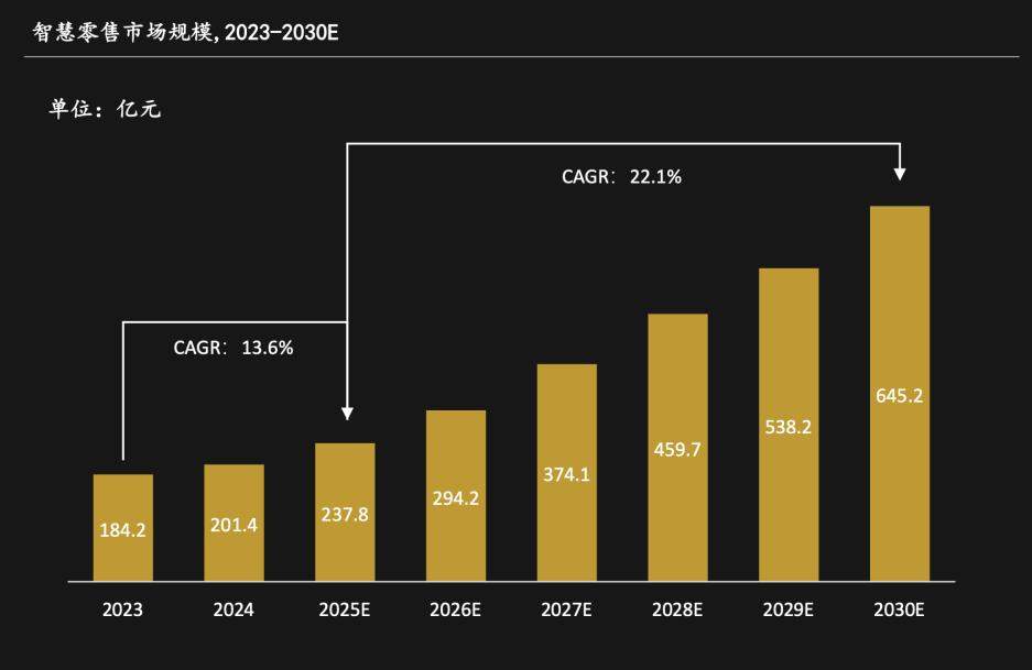 沙利文指出,智慧零售是面向零售企业的一套端到端经营解决方案,通过统一的消费者运营与门店经营体系,协同“人、货、场”的关键业务环节,驱动可衡量的增长与体验提升。2025年以来,受AI技术应用爆发驱动,智慧零售增长动能明显增强。报告预测,到2030年,中国智慧零售市场规模将有望达到约645亿元,年复合增长率达到22%。