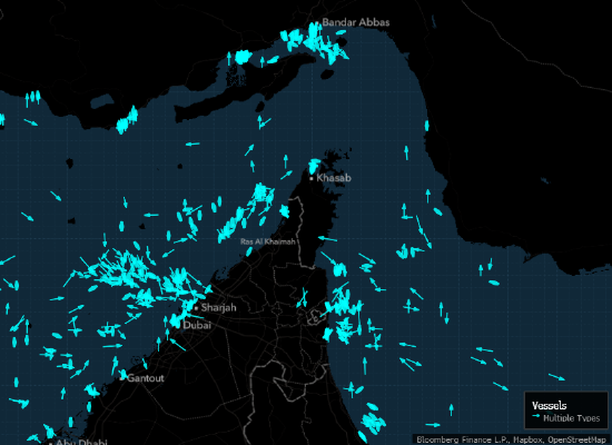 自周四早间以来,已观察到两艘与伊朗相关且遭美国制裁的油轮(其中之一为Arhimeda)、两艘散货船和一艘集装箱船驶离波斯湾。
