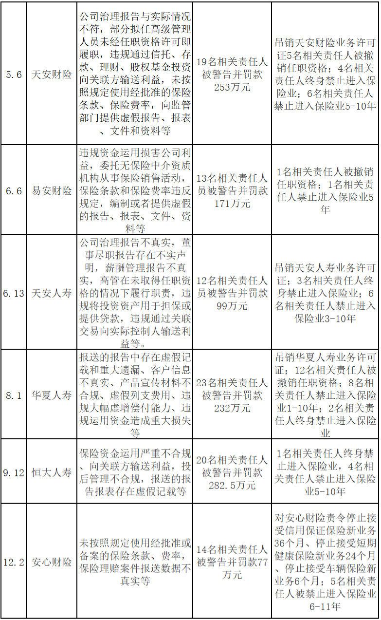 华夏人寿,23人被罚款232万元,12人撤销任职资格,2人终身禁业,2人10年禁业,1人8年禁业,1人5年禁业,1人3年禁业,3人1年禁业。