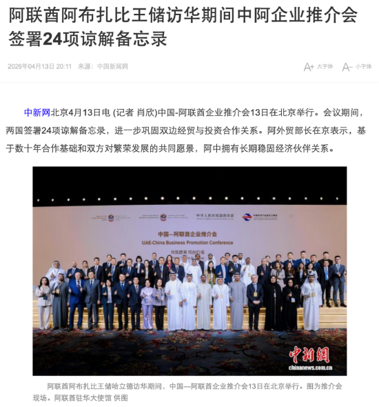 首先,这次中阿在北京签了24项谅解备忘录,阿联酋官方和多家媒体都确认了这一点: