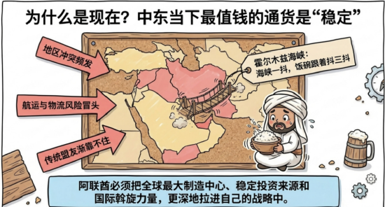 阿联酋很清楚,美国已经渐渐靠不住了。美国当然还是重要力量,但当地区风险、航运风险、金融风险一起冒头时,阿联酋必须把东大这个全球最大制造中心、重要能源买家、稳定投资来源和国际斡旋力量,更深地拉进自己的国家战略框架里!