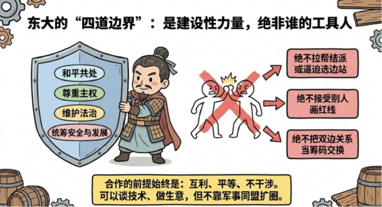 东大不会给任何人背书,合作的前提始终是:互利、平等、不干涉。
