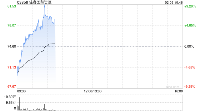 佳鑫国际资源(03858)盘中逆市涨超9%,截至发稿,股价上涨5.36%,现报78.60港元,成交额1.25亿港元。