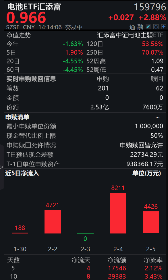 中企动力电池市占率首破 70%,全球首款钠电池也将“上车”,电池ETF汇添富(159796)大涨超3%,近5日吸金逾1.7亿