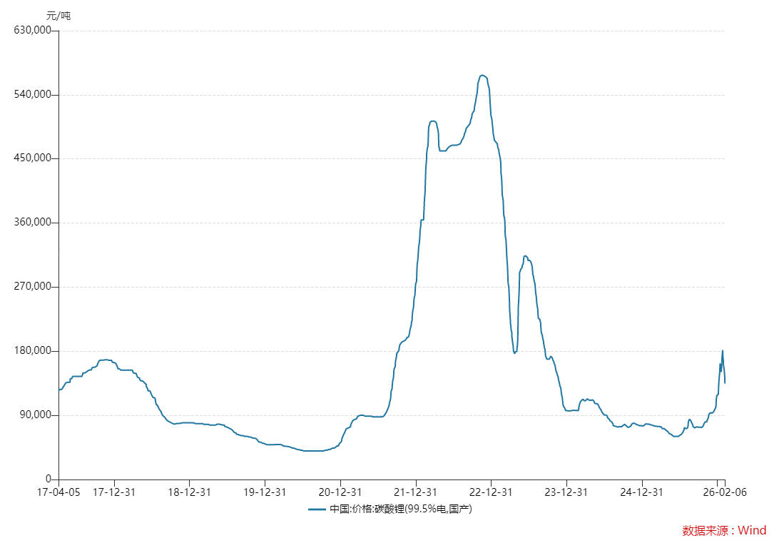 以具备行业价格指标属性的多晶硅价格、碳酸锂价格为例,碳酸锂价格自2025年6月开始复苏,2026年年初突破18万元/吨,但之后又急转直下,截至2026年2月6日落至13.44万元/吨。