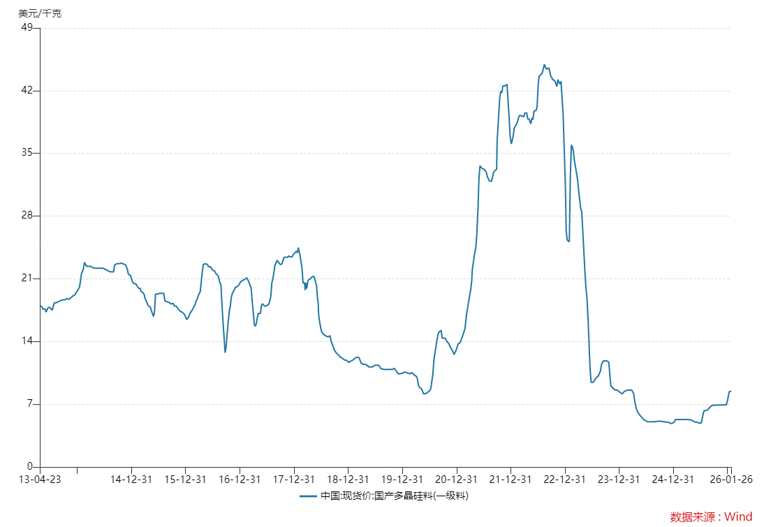 与此同时,国产多晶硅价格也自2025年6月开始反弹,已自5美元/千克左右的价格低点上涨至8.45美元/千克,虽反内卷已取得成效,但该价格水平仍处于历史低位。