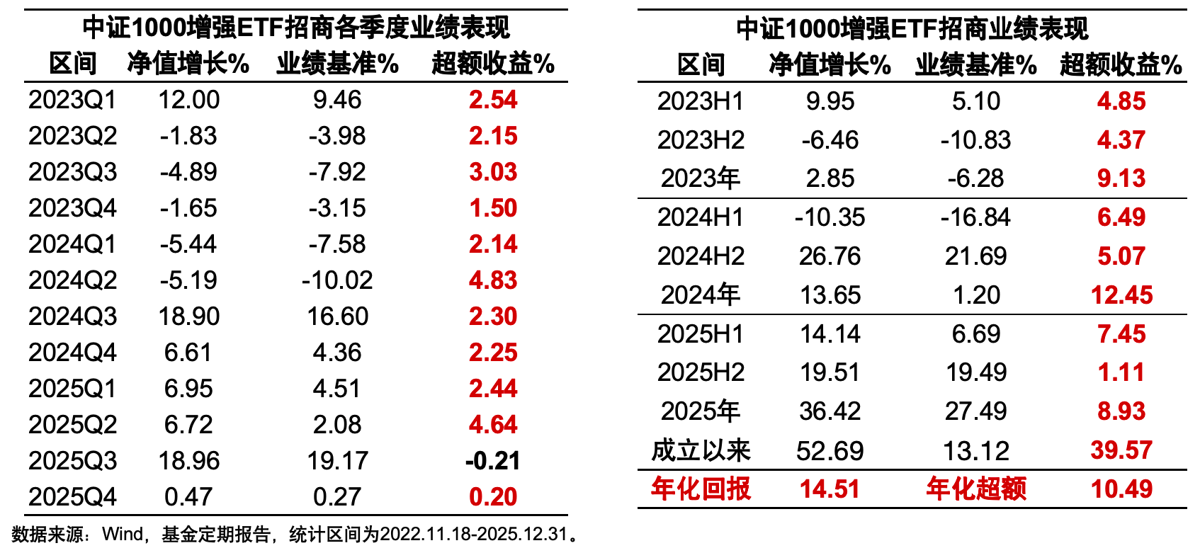 基金定期报告显示,截至2025年12月31日,中证1000增强ETF招商(159680)自成立以来累计净值增长率52.69%,相对业绩比较基准的超额收益率达39.57%。值得关注的是,中证1000增强ETF招商(159680)自2022年11月18日成立以来,各个季度、半年度、自然年度相对业绩比较基准均有超额收益。