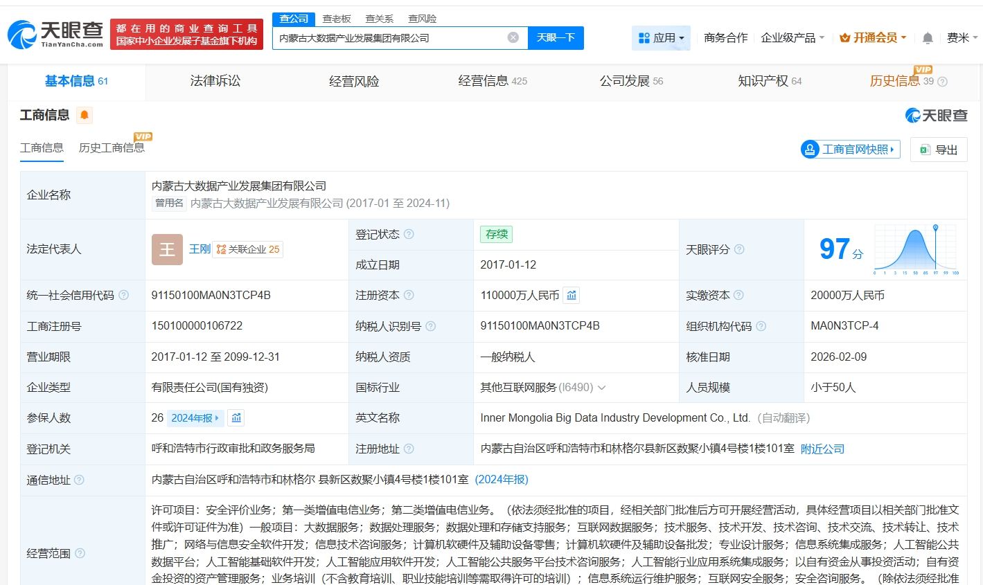 该公司成立于2017年1月,法定代表人为王刚,经营范围包括安全评价业务、第一类增值电信业务、第二类增值电信业务、大数据服务等,由呼和浩特市国有资产监督管理委员会全资持股。