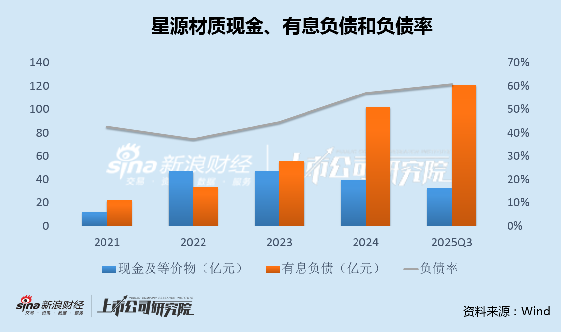 2016年,星源材质在A股上市,2019年和2022年又两次实施定增。几次融资后,星源材质负债率仍大幅走高并显著高于可比公司,有息负债上升尤为明显。
