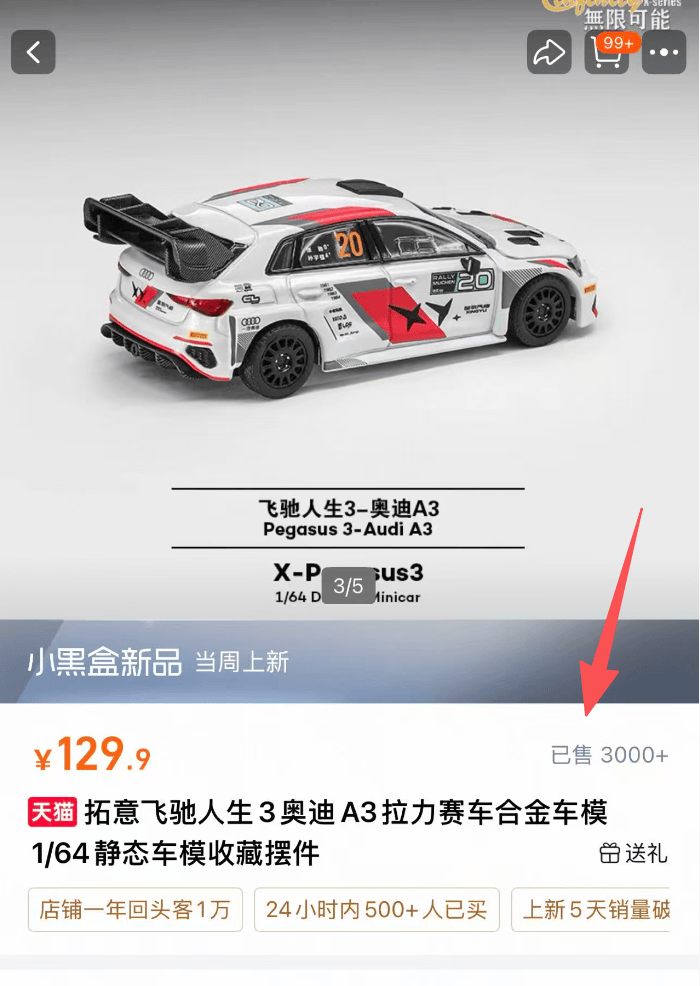 电商平台上一款名为“拓意飞驰人生3奥迪A3拉力赛车1:64”的官方联名车模售价129.9元,该产品上线时间为2月13日,截至发稿,车模已售出超3000单,24小时内已有500人购买。