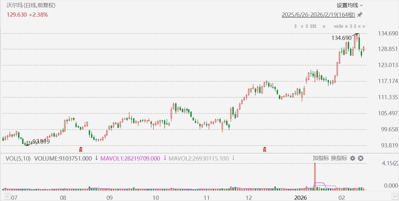 沃尔玛(WMT.US)盘初涨近3%,报130.1美元。消息面上,沃尔玛公布业绩显示,第四季度营收1906.6亿美元,高于预期的1905.8亿美元;调整后每股收益0.74美元,高于预期的0.73美元。预计第一季度调整后每股收益0.63美元-0.65美元;预计2027财年调整后每股收益2.75美元-2.85美元,低于预期的2.97美元。沃尔玛还宣布新的300亿美元股票回购计划。