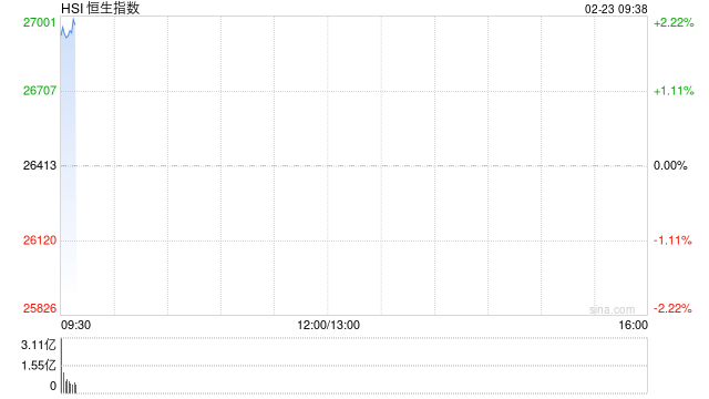 2月23日消息,港股三大指数开盘拉升,恒生指数、恒生科技指数涨超2%。恒指成分股中,紫金矿业涨超5%,美团涨超4%,中芯国际、京东、网易、舜宇光学科技等涨超3%
