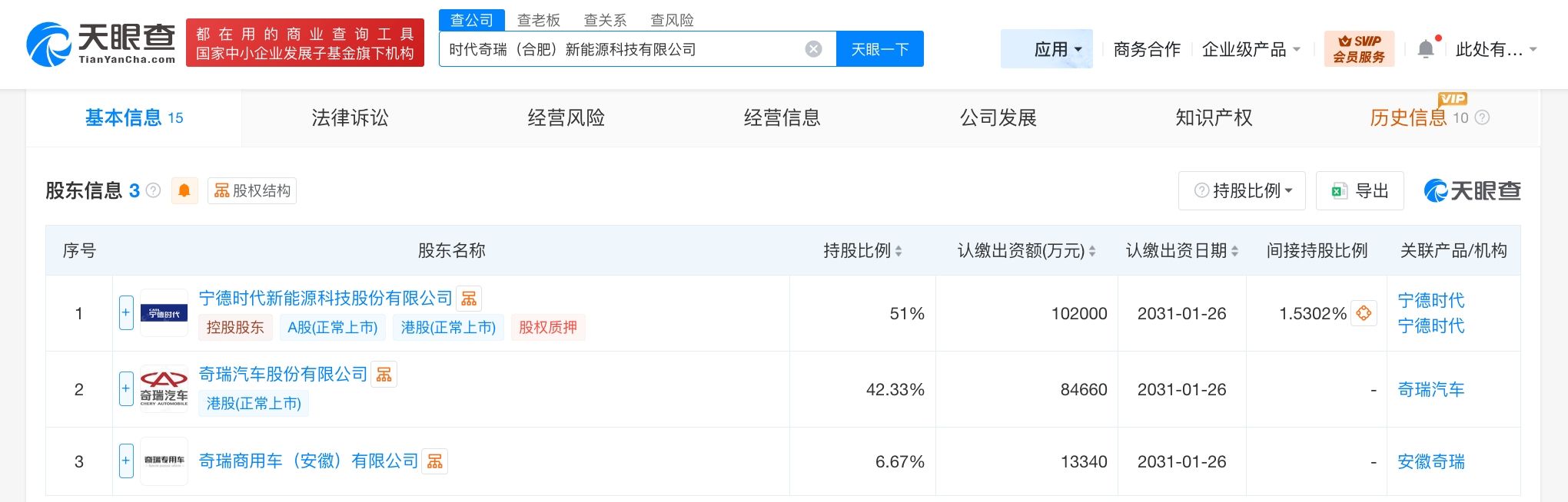 天眼查App显示,近日,时代奇瑞(合肥)新能源科技有限公司成立,法定代表人为来永杰,注册资本20亿人民币,经营范围为电池制造,电池零配件生产,电池销售,电池零配件销售,储能技术服务,技术服务、技术开发、技术咨询、技术交流、技术转让、技术推广,货物进出口。股东信息显示,该公司由宁德时代(300750)、奇瑞汽车股份有限公司、奇瑞商用车(安徽)有限公司共同持股。